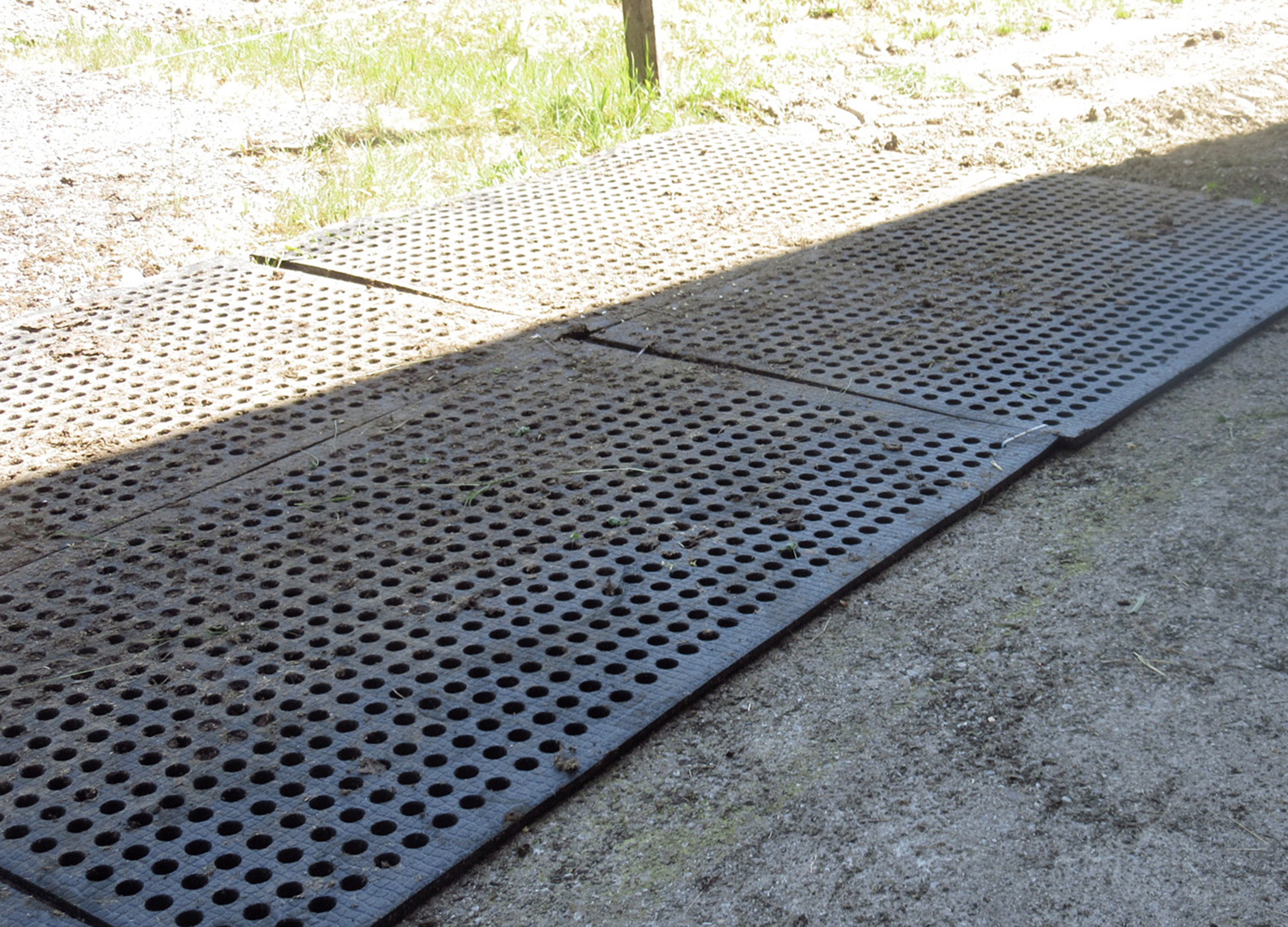 Eine ideale Lösung dafür ist die KRAIBURG LOMAX Lochmatte. Sie wurde speziell für matschige Böden entwickelt und passt sich ideal dem Untergrund an. Die Verlegung erfolgt ganz einfach ohne Unterbau, direkt auf dem Naturboden. Die Matten werden nur mit Kabelbindern aneinander fixiert und können so auch schnell wieder entfernt und neu verlegt werden. Über einen stabilen und sicheren Untergrund – ohne Versinken – freut sich Kuh und Halter!