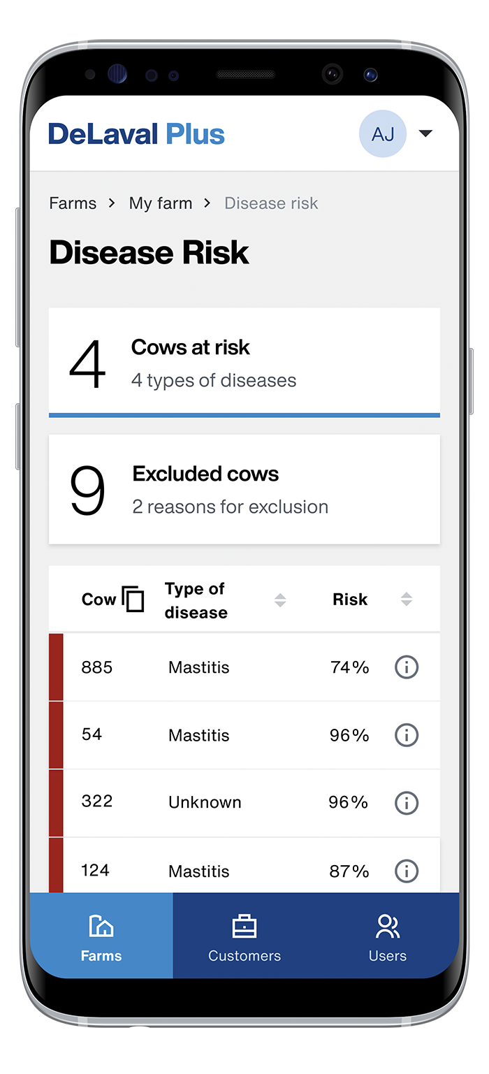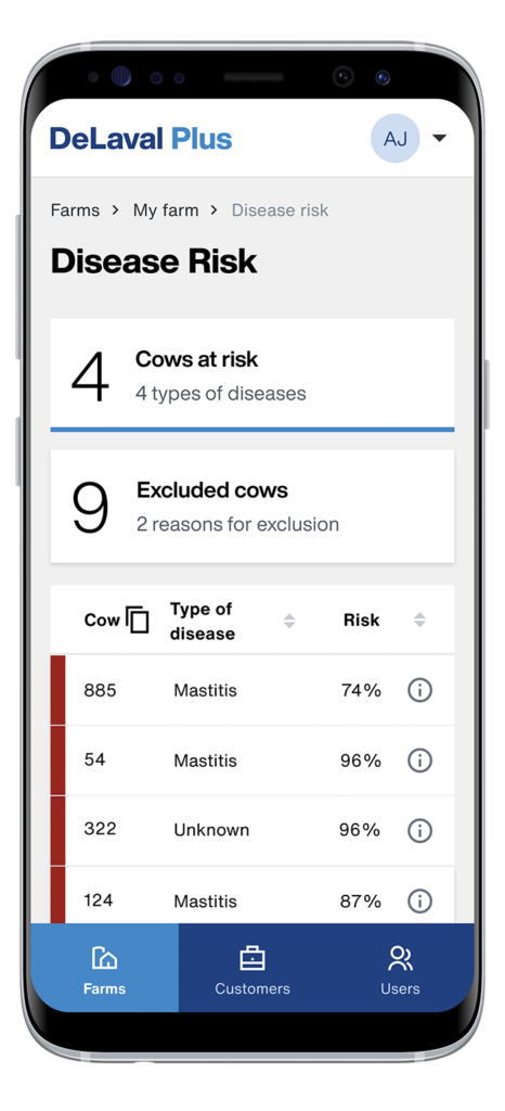 DeLaval Plus Analysen beinhalten z. B. die Anwendung „Reproduktionsleistung RePro“, die das Fruchtbarkeitsmanagement mit Key Performance Indicators (KPIs) und umsetzbaren Erkenntnissen unterstützt, um die Fruchtbarkeit zu verbessern. Die Anwendung nutzt die Daten des DeLaval VMS™ V310, das automatisch Progesteron misst, um ein umfassendes Verständnis der Reproduktionsleistung, der Zyklusqualität und der Zyklusregelmäßigkeit zu erhalten.DeLaval Plus Vorhersagen unterstützen Landwirte beim Management zukünftiger Ereignisse, indem mit der „Krankheitsrisiko“ Anwendung Indikatoren für das Krankheitsrisiko jedes Tieres geliefert werden. Dies hilft, Kühe mit Anzeichen auf z.B. Mastitis oder Ketose früher zu finden.