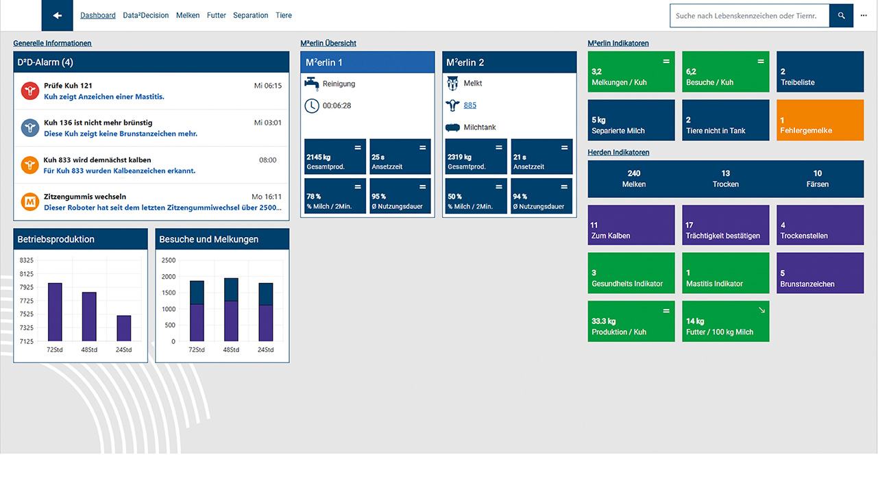 Fullexpert basiert auf dem innovativen Data²Decision-Ansatz. Damit wird Kellner aktiv informiert, erinnert und bei Entscheidungen unterstützt. In Echtzeit erhält er umfassende Einblicke in die Leistung der beiden M2erlin-Melkroboter und der Herde, automatisch ergänzt durch gezielte Empfehlungen und Erinnerungen. »D2D ist ähnlich aufgebaut wie mein E-Mail-Postfach. Morgens werden mir übersichtlich alle ToDos angezeigt. Ich weiß dann direkt, wie lange ich morgens für die Stallarbeiten benötigen werde«, so Kellner und ergänzt: »Treibliste, brünstige Kühe, Milchmenge, auffällige Kühe werden mir durch Farben (rot, orange, grün) priorisiert angezeigt. Es ist nicht mehr notwendig, lange Tierlisten zu durchstöbern.« Wenn dies doch mal gewünscht sei, verfügt das Programm über Möglichkeiten, die eine tiefergehende Datenanalyse erlaubt.